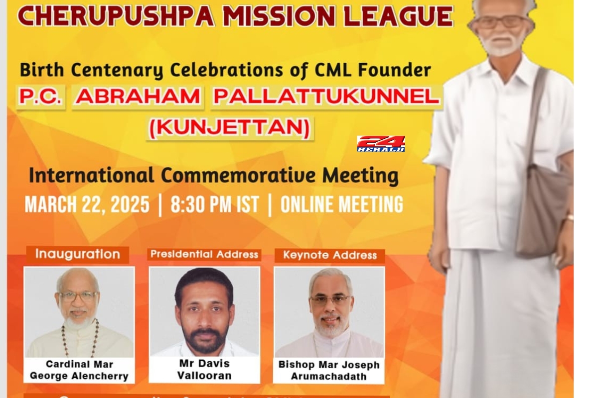 കാക്കനാട്: അന്തർദേശീയ കത്തോലിക്ക അല്തമായ സംഘടനയായ ചെറുപുഷ്പ മിഷൻ ലീഗ് (CML) സ്ഥാപകൻ "മിഷൻ ലീഗ് കുഞ്ഞേട്ടൻ" എന്ന പേരിൽ അറിയപ്പെടുന്ന ശ്രീ പി. സി. അബ്രഹം പല്ലാട്ടുകുന്നേലിന്റെ 100ാം ജന്മവാർഷിക ആചരണം അന്തർദേശീയ തലത്തിൽ സംഘടിപ്പിക്കുന്നു. മാർച്ച് 22 ശനിയാഴ്ച്ച ഇന്ത്യൻ സമയം രാത്രി 8:30ന് കൂടുന്ന ഓൺലൈൻ സമ്മേളനത്തിൽ വിശിഷ്ട വ്യക്തികളും വിവിധ രാജ്യങ്ങളിൽ നിന്നുമുള്ള ആളുകളും പങ്കുചേരും.