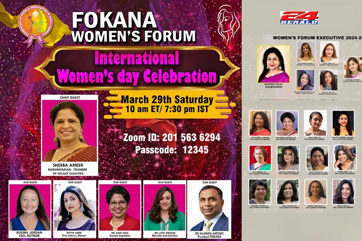 ഫൊക്കാന വിമൻസ് ഫോറം മാർച്ച് 29 ആം തീയതി രാവിലെ 10 am est സംഘടിപ്പിക്കുന്ന വിപുലമായ വിമൻസ് ഡേ പരിപാടിയിലേക്ക് എല്ലാവരെയും ഹാർദ്ദവമായി ക്ഷണിക്കുന്നു എന്ന് വിമൻസ് ഫോറം ചെയർപേഴ്സൺ ശ്രീമതി രേവതി പിള്ളയ് അറിയിച്ചു. സൊലസ് ഗ്ലോബൽ എന്നെ ജീവകാരുണ്യ സംഘടനയുടെ സാരഥി ആയ ശ്രീമതി ഷീബ അമീറിനെ വിശിഷ്ടാതിഥി ആയി ലഭിച്ചത് ഫൊക്കാനയുടെ അഭിമാനമായി കരുതുന്നു എന്ന് ഫൊക്കാന വിമൻസ് ഫോറം എക്സിക്യൂട്ടീവ് കമ്മിറ്റീ അഭിപ്രായപ്പെട്ടു. സ്വന്തം പ്രവർത്തന മേഖലയിൽ ഒന്നാം നിരയിൽ നിൽക്കുന്നവരെ തന്നെ ഈ പരിപാടിയിൽ അതിഥികളായ് കിട്ടി എന്നുള്ളത്‌ ഈ പരിപാടി യുടെ നിലവാരം ഉയർത്തും എന്നതിൽ സംശയം ഇല്ല എന്ന് ഫൊക്കാന വിമൻസ് ഫോറം സെക്രട്ടറി സുബി സൂചിപ്പിച്ചു.