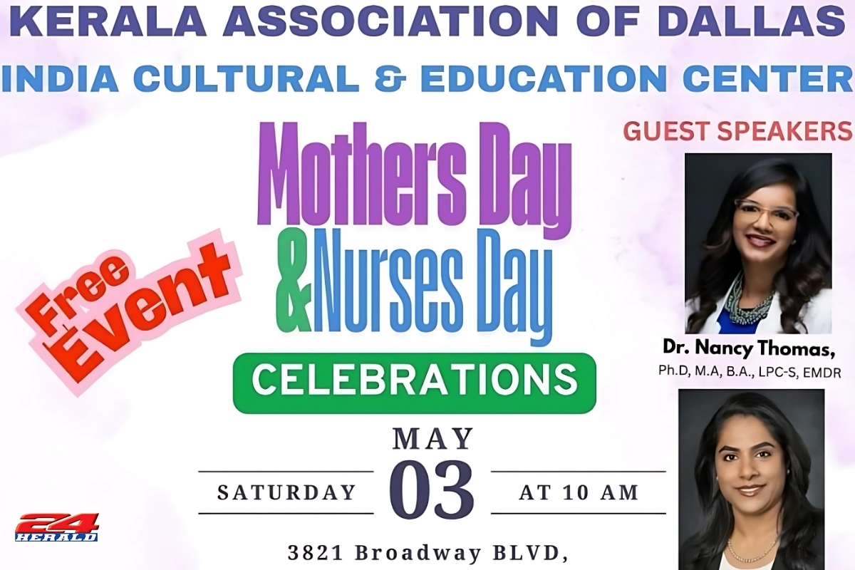 ഗാർലാൻഡ് (ഡാളസ്): കേരള അസോസിയേഷൻ ഓഫ് ഡാളസ്,ഇന്ത്യ കൾച്ചറൽ & എഡ്യൂക്കേഷൻ സെന്റർ സംയുക്തമായി "മദേഴ്‌സ് -നേഴ്സസ് "ദിനം മെയ് 3 നു ആഘോഷിക്കുന്നു.ഗാർലാൻഡ് കേരള അസോസിയേഷൻ കോൺഫ്രൻസ് ഹാളിൽ ശനിയാഴ്ച രാവിലെ 10 നു ആരംഭിക്കുന്ന സമ്മേളനത്തിൽ ഡോ. നാൻസി തോമസ്(പിഎച്ച്.ഡി, എം.എ, ബി.എ., എൽപിസി-എസ്, ഇഎംഡിആർ),ഡോ. വിജി ജോർജ് (ഡിഎൻപി, എം.എ., ആർഎൻസി-ഐഎൻസി, എൻഇഎ-ബിസി),എന്നിവർ വിവിധ വിഷയങ്ങളെ കുറിച്ച് പ്രഭാഷണം നടത്തും.അമ്മമാരെയും നഴ്സുമാരെയും ആദരിക്കുന്ന ചടങ്ങിൽ പങ്കെടുക്കുന്നതിനു ഏവരെയും ക്ഷണിക്കുന്നതായി സംഘാടകർ അറിയിച്ചു
