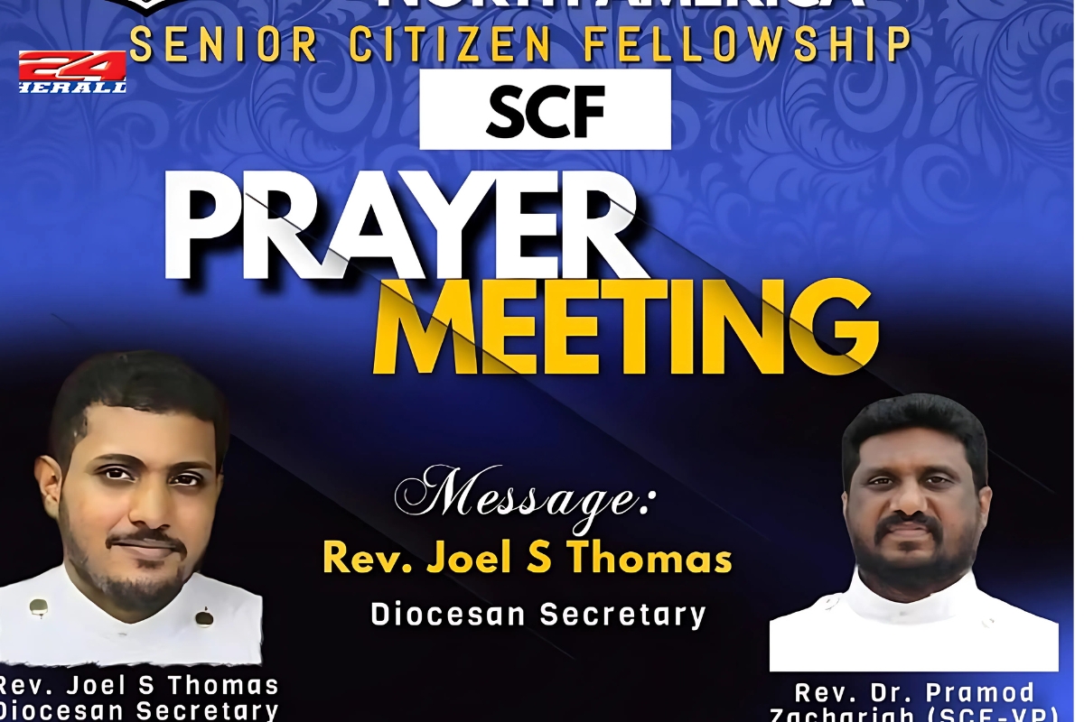 ന്യൂയോർക് :നോർത്ത് അമേരിക്ക മാർത്തോമ്മാ ഭദ്രാസനം സീനിയർ സിറ്റിസൺ ഫെലോഷിപ്പിന്റെ ആഭിമുഖ്യത്തിൽ മെയ് 12നു തിങ്കൾ രാത്രി 8-00 (ഇഎസ്ടി) സൂം പ്ലാറ്റഫോമിൽ പ്രയർ മീറ്റിംഗ് സംഘടിപ്പിക്കുന്നു റവ. ജോയൽ എസ് തോമസ്,ഭദ്രാസന സെക്രട്ടറി മുഖ്യ സന്ദേശം നൽകും