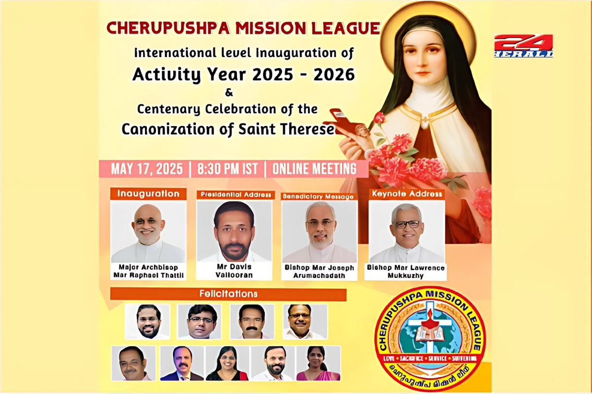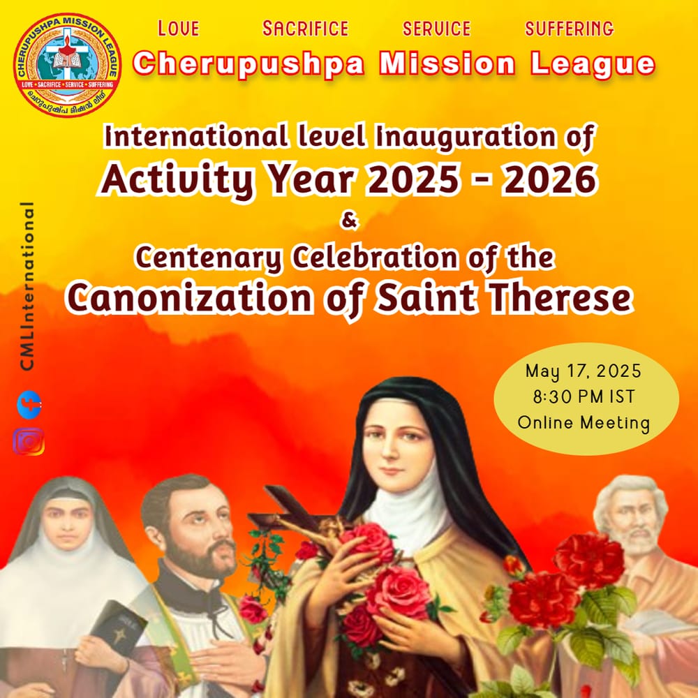The Cherupushpa Mission League (CML), an international Catholic lay organization, will officially launch its 2025–2026 activity year with a global online gathering on Saturday, May 17, at 8:30 PM IST. The event will also commemorate the 100th anniversary of the canonization of Saint Thérèse of Lisieux, fondly known as Little Thérèse or Cherupushpam, the heavenly patroness of the Mission League. The international inauguration will witness participation from CML representatives and leaders across various countries.