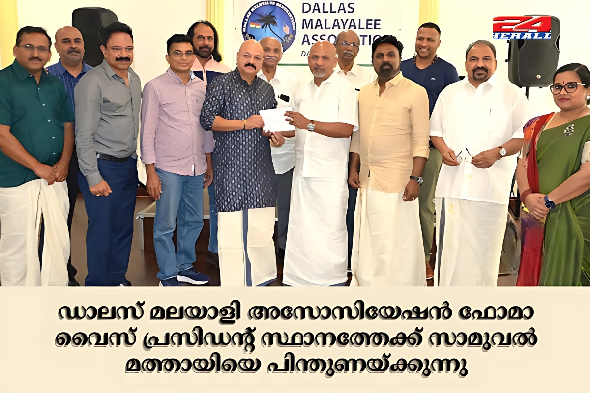 ഡാലസ്: ഡാലസ് മലയാളി അസോസിയേഷന് അംഗവും മുന് പ്രസിഡന്റുമായ സാമുവല് മത്തായിയെ 2026ല് ഹ്യൂസ്റ്റണിലെ ഫോമാ കണ്വന്ഷനോടുബന്ധിച്ചു നടക്കുന്ന തിരഞ്ഞെടുപ്പില് വൈസ് പ്രസിഡന്റ് സ്ഥാനത്തേക്കുള്ള മത്സരത്തിലേക്കു അസോസിയേഷന് നേതൃത്വം നാമനിര്ദേശം നല്കി. അസോസിയേഷന് പ്രസിഡന്റ് ജൂഡി ജോസ് അഗികാരമുദ്രയായ ഔദ്യോഗീക കത്ത് സാമുവല് മത്തായിക്കു ഡാലസില് നടന്ന മനോരമ ഹോര്ത്തുസ് ചടങ്ങില് വച്ചു കൈമാറി.