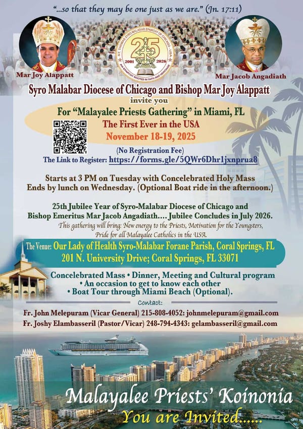 നവംബറില് മയാമിയില് നടക്കുന്ന സമാനതകളില്ലാത്ത ഈ ഒത്തുചേരലില് അമേരിക്കയിലെ മലയാളി കത്തോലിക്കര്ക്ക് അഭിമാനം പകരുന്ന പുതുമയേറിയ സ്മരണയ്ക്ക് ഈ സംഗമം സാക്ഷിയാകും.