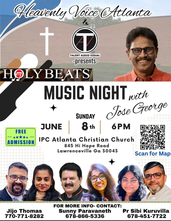 അറ്റ്ലാന്റ:ഹെവൻലി വോയ്‌സ് അറ്റ്ലാന്റയുടെ ആഭിമുഖ്യത്തിൽ ഹോളിബീറ്റ്സ് സംഗീത രാത്രി ജൂൺ 8 ഞായർ വൈകുന്നേരം 6 ന് സംഘടിപ്പിക്കുന്നു ഐപിസി അറ്റ്ലാന്റ ക്രിസ്ത്യൻ ചർച്ചിൽ (845 ഹായ് ഹോപ്പ് റോഡ് ലോറൻസ്‌വില്ലെ 30043) ജോസ് ജോർജിന്റെ നേത്ര്വത്വത്തിൽ നടക്കുന്ന മ്യൂസിക് നൈറ്റിലേക് പ്രവേശനം