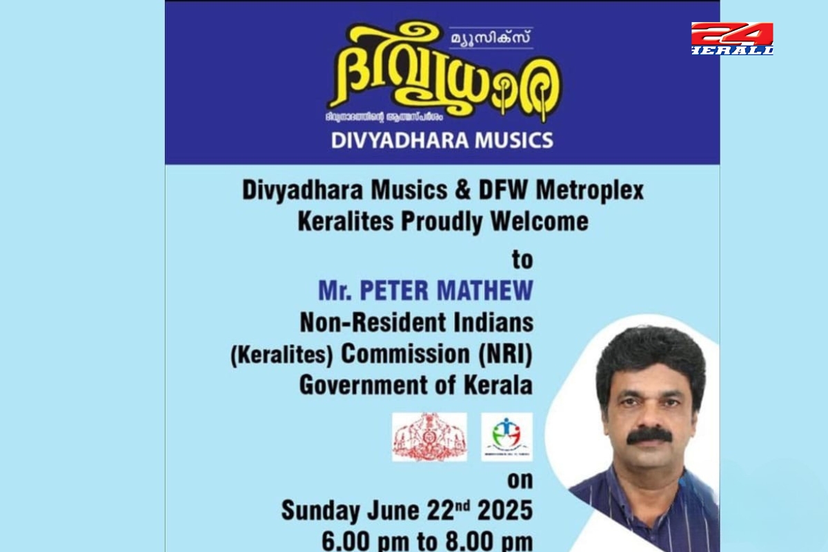ഇർവിങ് (ഡാളസ്):ഡിഎഫ്ഡബ്ല്യു മെട്രോപ്ലക്സ് ദിവ്യാധാര മ്യൂസിക്സ് മ്യൂസിക്സ് നൈറ്റും അവാർഡ് ദാനവും സംഘടിപ്പിക്കുന്നു. 2025 ജൂൺ 22 ഞായറാഴ്ച വൈകുന്നേരം 6.00 മുതൽ രാത്രി 8.00 വരെ ഐപിസി എബനേസർ ഫുൾ ഗോസ്പൽ അസംബ്ലിയിലാണ്(1927 റോസ്ബഡ് ഡോ, ഇർവിംഗ്, ടെക്സാസ് 75060).വേദി ഒരുക്കിയിരിക്കുന്നത്