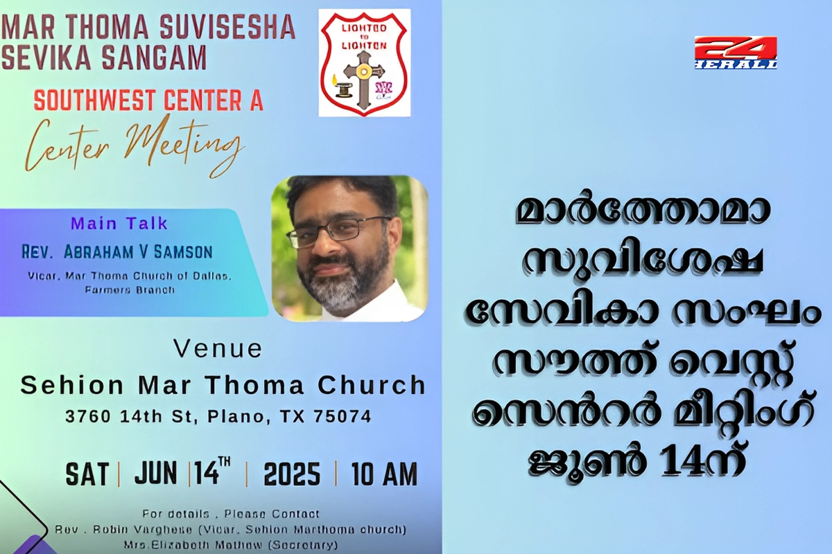 പ്ലേനോ ഡാളസ് : മാർത്തോമാ സുവിശേഷ സേവികാ സംഘം സൗത്ത് വെസ്റ്റ് സെൻറർ എയുടെ ആഭിമുഖ്യത്തിൽ  സംഘടിപ്പിക്കുന്നു. ജൂൺ 14 ശനിയാഴ്ച രാവിലെ 10 മുതൽ പ്ലാനോ സെഹിയോൻ മാർത്തോമ ചർച്ചിൽ ആരംഭിക്കുന്ന യോഗത്തിൽ മാർത്തോമാ ചർച്ച് ഓഫ് ഡാലസ് ഫാർമേഴ്സ് ബ്രാഞ്ച് വികാരി റവ:എബ്രഹാം വി സാംസൺ മുഖ്യപ്രഭാഷകൻ ആയിരിക്കും. സൗത്ത് വെസ്റ്റ് സെൻററിലെ എല്ലാ ഇടവകകളിൽ നിന്നുള്ള സുവിശേഷ സേവികാ അംഗങ്ങൾ  ഈ മീറ്റിംഗ് വന്ന് പങ്കെടുക്കണമെന്ന് സംഘാടകർ അഭ്യർത്ഥിക്കുന്നു