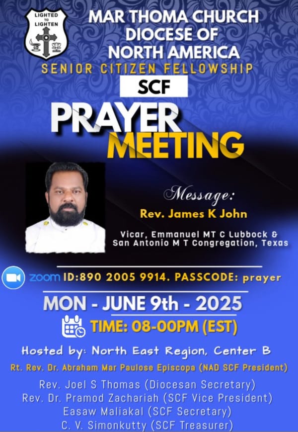 ന്യൂയോർക് :നോർത്ത് അമേരിക്ക മാർത്തോമ്മാ ഭദ്രാസനം സീനിയർ സിറ്റിസൺ ഫെലോഷിപ്പിന്റെ ആഭിമുഖ്യത്തിൽ may 12 to june 9 നു തിങ്കൾ രാത്രി 8-00 (ഇഎസ്ടി) സൂം പ്ലാറ്റഫോമിൽ പ്രയർ മീറ്റിംഗ് സംഘടിപ്പിക്കുന്നു