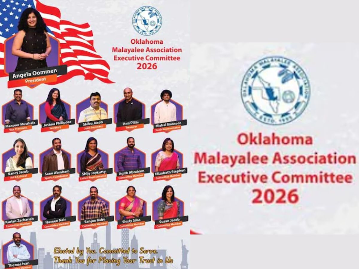 ഓക്ലഹോമ മലയാളി അസോസിയേഷൻ (ഒഎംഎ) 2026-ലേക്കുള്ള പുതിയ ഭാരവാഹികളെ പ്രഖ്യാപിച്ചു. എയ്ഞ്ചലാ ഉമ്മൻ (പ്രസിഡന്റ്), ജോഷ്ന ഫിലിപ്പോസ് (സെക്രട്ടറി), അനിൽ പിള്ള (ട്രഷറർ) എന്നിവരടങ്ങുന്ന പുതിയ നേതൃത്വ കമ്മിറ്റി ഔദ്യോഗികമായി ചുമതലയേറ്റു. മൻസൂർ മുസ്തഫ, ഷിബു ജേക്കബ്, മിഷാൽ മൻസൂർ, നാൻസി ജേക്കബ്, സനു എബ്രഹാം, ഷിജി ജോയിക്കുട്ടി, അജിത് എബ്രഹാം, എലിസബത്ത് സ്റ്റീഫൻ, കുരിയൻ സക്കറിയ, നവീൻ നായർ, സാൻജോ ബാബു, ഷേർലി സൈലസ്, സൂസൻ ജേക്കബ് എന്നിവരാണ് എക്സിക്യൂട്ടീവ് കമ്മിറ്റിയിലെ മറ്റ് അംഗങ്ങൾ.