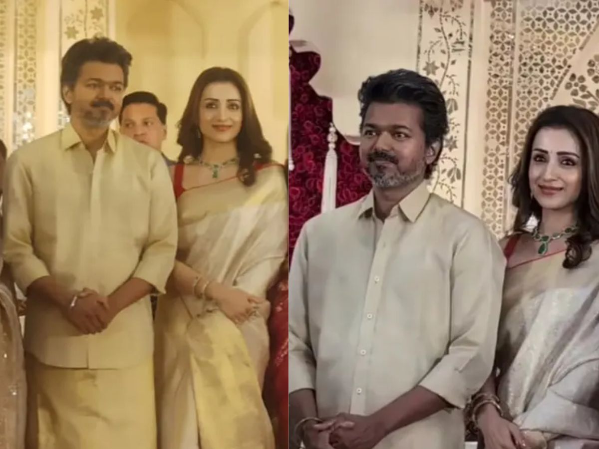 സ്വർണ്ണനിറമുള്ള സിൽക്ക് ഷർട്ടും മുണ്ടും ധരിച്ച് വിജയ് എത്തിയപ്പോൾ, ചുവപ്പ് ബോർഡറുള്ള സിൽക്ക് സാരിയും സ്ലീവ്‌ലെസ് ബ്ലൗസുമായിരുന്നു തൃഷയുടെ വേഷം....